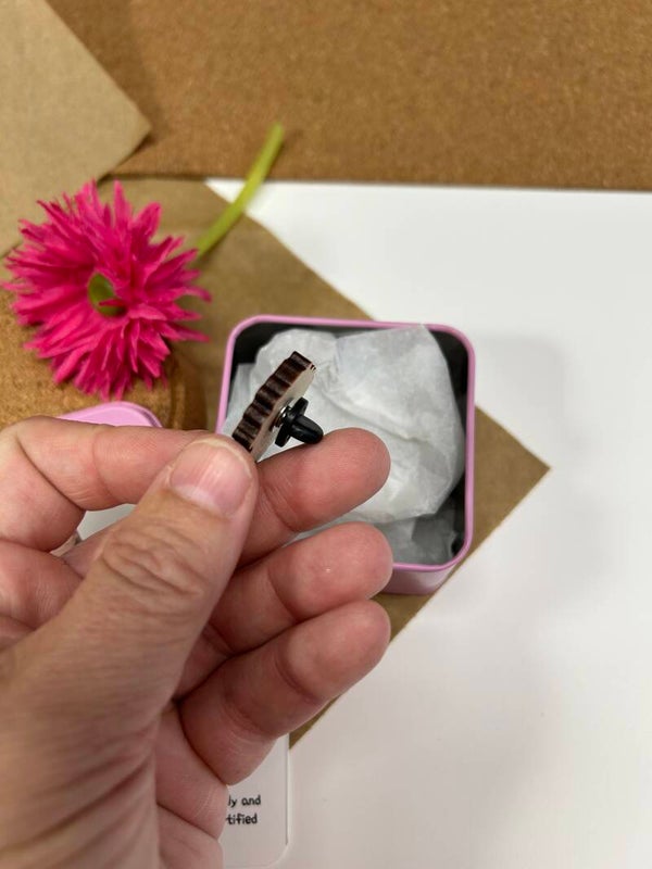 Deze houten pin is een juweeltje op zich. Als cadeautje voor iemand, of voor jezelf.